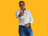 Mann in weißem Hemd und Jeans zeigt mit dem Finger auf den Betrachter.